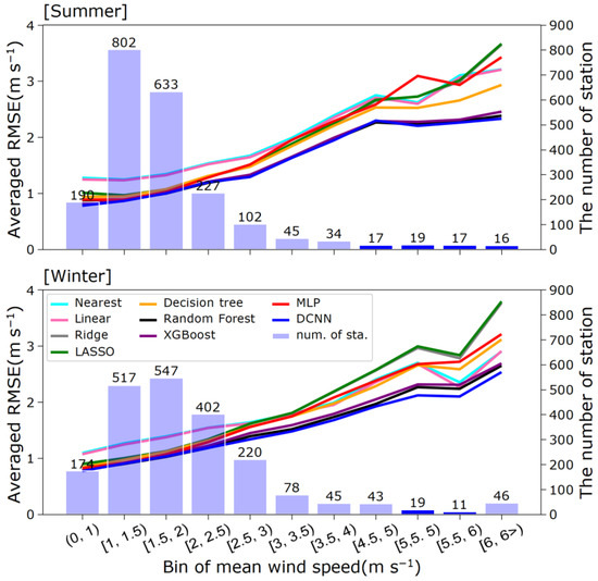 Comparing each model’s results for winter and summer shows that R2 is higher for winter than for summer; however, RMSE shows the same trend. For example, DCNN has a better R2 in winter than in summer (0.64 vs. 0.55) but a larger RMSE in winter (1.21 vs. 1.09). This is mainly attributed to the absolute WS10 being greater in winter: the mean summer wind speed is 2.23 m s−1, less than the winter average of 2.51 m s−1.