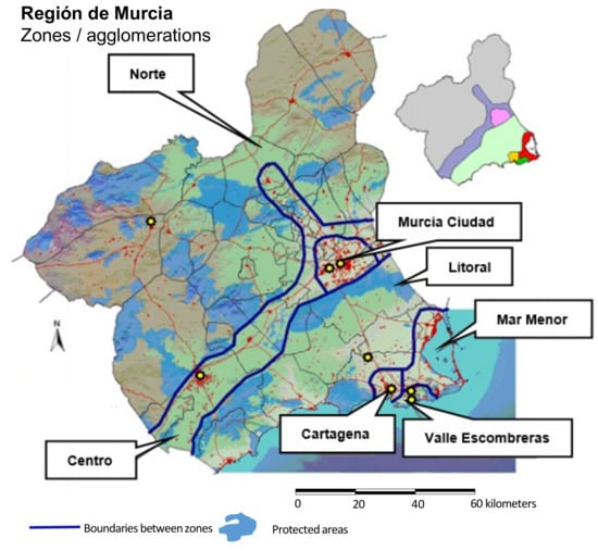 Región de Murcia is an area of 11,300 km located in the southeast of Spain with a population of 1.5 million inhabitants. For the purpose of air quality management, it is divided into 6 zones. Three of these zones (Norte, Centro, and Litoral-Mar Menor) have an important ecological value, agricultural and livestock activities, and medium-scale industry (see Figure 1). There is a typical urban zone (Murcia City), one industrial zone (Valle de Escombreras), and a zone that is both urban and industrial (Cartagena). Each one of these zones has an air quality monitoring station (AQMS), with the exception of Murcia City and Valle de Escombreras, which have two of them.