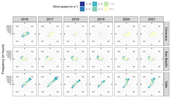 A preliminary study was carried out in order to check if there were significant differences in meteorological observations during the years of the study. For this, wind roses were obtained to compare speed and wind direction in the three selected locations (San Basilio, Caravaca, and Valle). In Figure 2, it can be seen how the predominant wind directions remained constant in Caravaca and San Basilio throughout the years. In Caravaca, during the studied period, the main wind directions were E, ENE, and SW with a prevalence of calm or light air most of the time. An exception is the year 2016, when significantly higher wind speeds were registered; see Figure 3. Monthly average wind speed was most of the time below 1.75 m·s. In San Basilio, the dominant wind directions were WNW, NW, and W, and the monthly average wind speed was in general lower than 2 m·s. Maximum and minimum daily wind speeds ranged during the studied period from 5.03 to 6.33 m·s and from 0.83 to 1.25 m·s, respectively. Last, the dominant wind direction in Valle was NE in 2016 to 2019, followed by SW and NNE. However, in 2020 and 2021, the main wind directions were NNE and N, followed by SW. Wind intensity was higher in Valle, as is typical of coastal locations, with monthly average values ranging from 2.75 to 2.94 m·s. Maximum and minimum daily wind speed ranged during the studied period from 5.79 to 9.57 m·s and from 2.67 to 2.79 m·s, respectively.