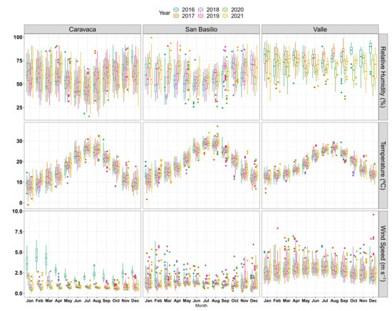 Monthly median temperatures did not experience significant differences over the years. RH experienced the highest daily variability and so did the monthly averages. There were some months significantly more humid or dryer than others (e.g., October and December 2016 in Valle or March 2018 in San Basilio).