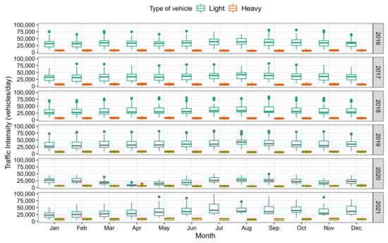 In order to check the recovery of traffic intensity during 2021 to typical pre-pandemic values, data from several traffic stations located on the A-7 highway where it crosses Región de Murcia were analyzed. Daily average traffic intensity is shown in Figure 4 as a function of the month and the year, from 2016 to 2021. From 2016 to 2019, it can be seen how the traffic intensity of light-duty vehicles was similar along the years, fluctuating between 30,000 and 40,000 vehicles/day. July, August, and September were the months that registered higher traffic intensity due to the summer holiday season. However, in 2020, an atypical trend can be seen, with minimum values of traffic intensity in April, due to the lockdowns and mobility restrictions applied to contain the spread of COVID-19. Maximum values of traffic intensity in 2020 were also registered in July and August, but they did not reach 30,000 vehicles/day. In 2021, traffic intensity recovered up to values similar to those in the period 2016–2019. Moreover, from May 2021 until the end of the year, traffic intensity was higher than in the period 2016–2019, probably due to a rebound effect when COVID-19 restrictions to mobility were lifted. On the other hand, the traffic intensity of heavy-duty vehicles was more homogeneous over the years. Minimum traffic intensity was registered in August in all the years. A slight decrease in traffic intensity was registered from April 2020, but it was not as remarkable as the one experienced by light-duty vehicles. In 2021, the traffic intensity of heavy-duty vehicles increased again to reach pre-pandemic values.