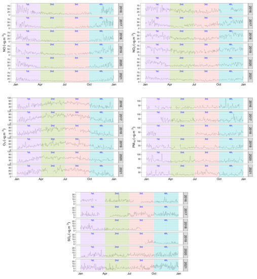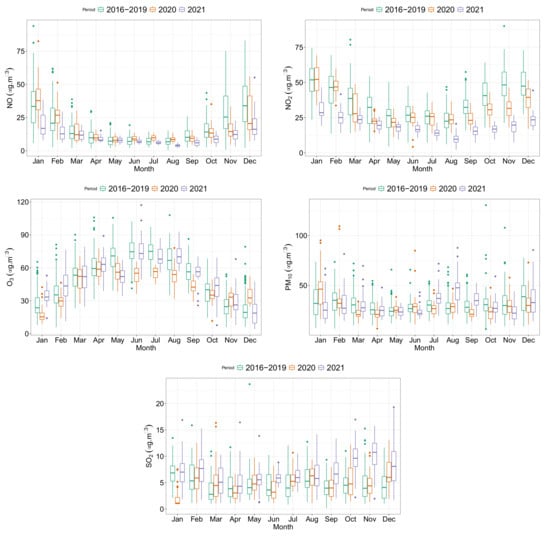 In this study, we focused on three periods: (i) from January 2016 to December 2019, (ii) the year 2020, and (iii) the year 2021. By grouping them thusly, we can compare the ambient concentrations of pollutants in both 2020 and 2021 with the ambient concentrations before the pandemic to establish if the pollutant concentrations in 2021 still remained below pre-pandemic values.