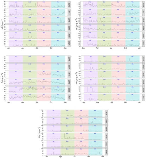 No significant differences were found in the concentrations of SO in 2020 and in previous years, except in January. On the contrary, in the last few months of 2021, the concentrations increased (the annual mean concentration in 2021 was 7.13 g·m in comparison to 4.86 g·m in 2020). Nevertheless, the concentrations of SO were well below its hourly and daily limit values (350 and 125 g·m, respectively) with the maximum daily concentration in the studied period being 23.7 g·m in 2016; so, despite the latest rise, SO is a pollutant that is under control.