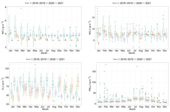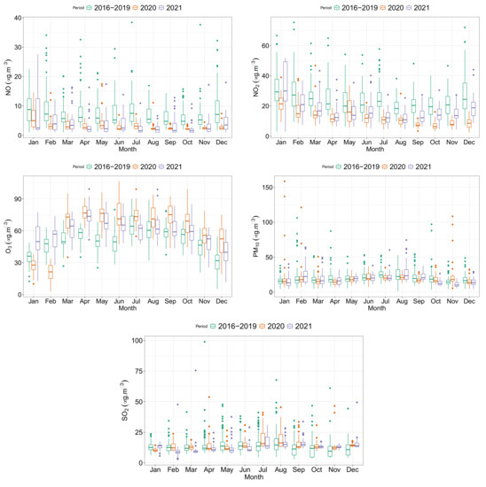 Something similar can be observed for NO. The concentrations of this pollutant were significantly lower in 2020 than in previous years only from September to November, although the variability of the concentrations was clearly lower than in previous years (Figure 6). However, the concentrations of NO in 2021 were significantly lower in almost every month than those in 2020. This is in agreement with the observed trend in the concentrations of NO.