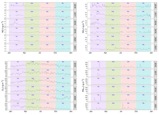 In Figure 5, the yearly evolution of the concentrations of NO, NO, PM, and O is shown. Both NO and NO concentrations were lower in summer than in winter months for all the years studied, with higher variability of concentrations in the cold months. This is due to worse atmospheric conditions, which impede the dispersion of pollutants in winter when the atmospheric stability is higher. There were no significant differences between the concentrations of NO in 2020 and in previous years. In 2021, however, NO concentrations were lower than in previous years. The analysis of the traffic data showed that traffic intensity had gradually increased from 2020 to 2021. In fact, it was even higher than in the period of 2016–2019. However, this did not translate into higher concentrations of NO in 2021. Two possible explanations may be (i) the progressive renovation of the vehicle fleet in favor of hybrid and electric vehicles and (ii) more favorable meteorological conditions for the dispersion of pollutants in 2021. These two hypothesis will be addressed in Section 4.