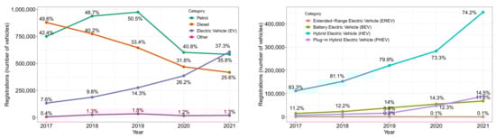 Total vehicle registrations (left) and electric vehicle registrations (right) according to the category during the period of 2017–2021 in Spain. The percentages of registrations of each type of vehicle were obtained for each year. Source: Dirección General de Tráfico, Spain.