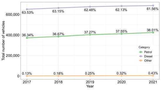 When the weight of greener vehicles (EV, HEV, natural gas, and LPG) is computed in the vehicle fleet of Región de Murcia, their share turns out to be negligible (<0.5%) (“Other” category in Figure 12). The percentage of these vehicles is slowly increasing year after year, as well as the percentage of petrol and diesel ones and the total number of vehicles. Thus, it seems it will take a few years to start noticing the positive effects of electric cars and the new European deal on the air we breathe.