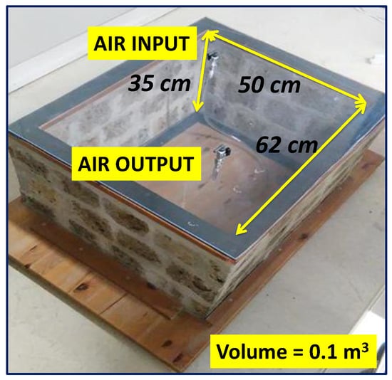 As reported in [6,14], the model room was built with a very porous ignimbrite, called “Tufo di Gallese”, rich in radon and thoron precursors and thus characterised by high radon and thoron exhalation rates of 5.91 ± 0.14 and 6434 ± 494 Bq m−2 h−1, respectively. Only the walls of the chamber were created with ignimbrite stone (surface area of 0.78 m2), while the floor and the roof were created with plexiglas boards. The system was created to evaluate the prevalent role of the chamber walls on indoor radon concentration while also considering its interaction with the outdoor environment. The inner volume of the room was approximately 0.110 m3. Two taps applied on the upper Plexiglas board (Figure 1) allowed the air exchange and the connection with the RAD7 monitor (Durridge Company Inc., Billerica, MA, USA) via vinyl tubing.