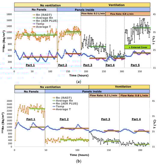 Average and standard deviation of radon activity concentrations in different intervals of experiment 13 (Table 2 and Figure 2b) demonstrate that equilibrium conditions are already reached after 24 h from the beginning of each part. Time counting is continuous within each test and not interrupted at the end of the single experimental parts.