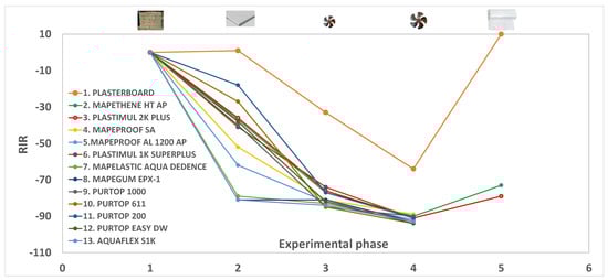 Taking into consideration the relative change in indoor radon (RIR) determined in the second part of the experiments (Table 2 and Figure 3), it emerges that synthetic resins (samples 7 and 8) are the products with the best performance, reducing radon by approximately 81%. A similar outcome is provided by a silane-terminated polymer (sample 13, see Figure 2b).