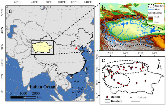 Location of the Tarim Basin.((a)—the location of the study area; (b)—the drainage systerm and elevation of Tarim Basin; (c)—distribution of meteorological stations in The Tarim Basin).
