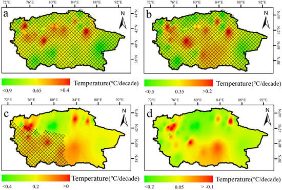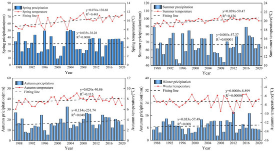 Temporal characteristics of seasonal climate change in the Tarim Basin. Panels show the climate change in spring, summer, autumn, and winter, respectively.