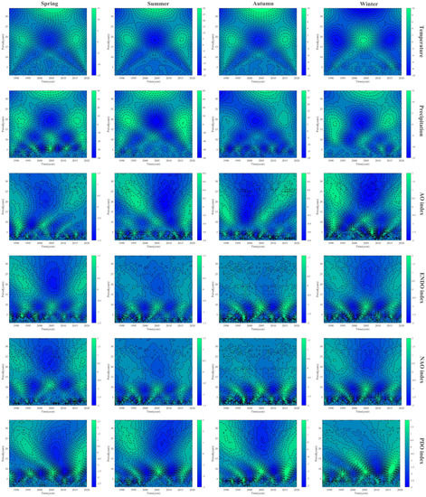 The wavelet transforms of climate change and atmospheric conditions in the Tarim Basin from 1987 to 2020 (Different factors of climate change and atmospheric circulation are listed on the horizontal and at different seasonal scales on the vertical).