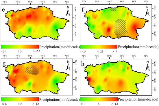 Spatial variations in seasonal climate change in the Tarim Basin. (a–d) Temperature variations in spring, summer, autumn, and winter, respectively. (e–h) Precipitation variations in spring, summer, autumn, and winter, respectively (The black grid indicates that the trends are statistically significant at the 0.05 level).
