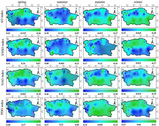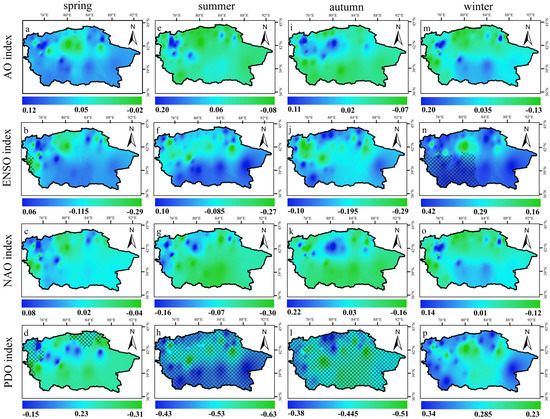 Spatial distribution of the correlation between average annual temperature and atmospheric circulation in the Tarim Basin. Each column corresponds to a season, and each row corresponds to an atmospheric circulation index (the black bars on the grid indicate that the trends are statistically significant at the 0.05 level).
