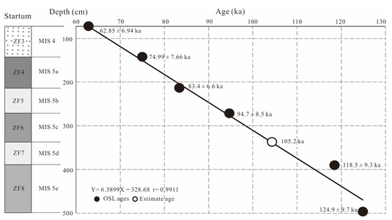 The ages obtained from OSL dating of seven samples are listed in Table 2, while the relationship between chronology and depth is shown in Figure 2, where a strong linear relationship with a correlation coefficient of r = 0.9904 can be observed. The geological age at the base of the ZF8 was 124.9 ± 9.7 ka, and parallel samples at the base of ZF3 gave dates of 70.18 ± 9.67 and 79.8 ± 5.64 ka, respectively; their average value of 74.99 ka corresponds to the beginning of MIS 5 [32]. The sedimentation rate was calculated according to the ages of the top of ZF6 and ZF8, and then used to infer the age of the base of ZF7 (Figure 2). On the basis of the lithological characteristics and ages of each stratum, and comparison with MISs, we consider ZF3 as deposited at 62.85–74.99 ka, corresponding to early-middle MIS 4. Hence, units ZF4-ZF8 belong to MIS 5. All chronological ranges and corresponding MISs of each stratum are shown in Table 3.