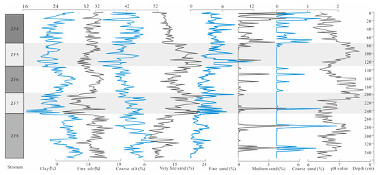 The geological age of ZF5 is 83.4–94.7 ka, corresponding to MIS 5b. In this stage, the average Mz was 5.95 Φ, average clay content was 22.44%, and average EM1 content was 47.02%, all being significantly lower than the MIS 5 averages and corresponding to distinct troughs. The average EM3 content was 35.83%, the highest value observed throughout MIS 5. These characteristics indicate a cold–dry environment with strong transport power and weak weathering pedogenesis effect. The pH showed a trend of increasing at first and then decreasing with depth; it was >7 in the upper part of the unit and <7 in the lower part, varying from 6.45 to 7.64, with an average of 7.09. This is higher than the MIS 5 average and weakly alkaline. This indicates that the leaching effect was weak, leading to a decrease in the concentration of free H+ in the soil, corresponding to a climatic environment with less precipitation.