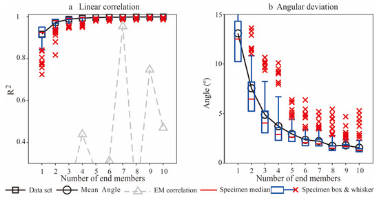 Relationships among linear correlation, angular deviation, and endmember numbers in the grain size EM analysis of the ZFS.