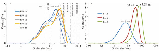 Figure 5a shows the frequency distribution curves of representative samples of each stratum. Each sample exhibited a bimodal state: a main mode was located in the coarse silt-fine sand interval of 20–70 μm, and a secondary mode was located in the silt interval of 3–10 μm, representing two different dynamic environments. Figure 5b shows three EM components of the ZFS; the modal grain size of EM1 was 6.45 μm and Mz was 4.86 μm, belonging to the clay-fine silt fraction; σ was 2.87, indicating poor sorting (clay content was 41.17%, silt content was 58.70%, and sand content was 0.14%); Sk was −0.44, representing an extremely negative deviation distribution; Kg was 3.14, indicating a very narrow peak. The modal grain size of EM2 was 35.62 μm and Mz was 27.11 μm, belonging to the coarse silt grain size; the σ was 1.94, indicating poor sorting (clay content was 1.14%, silt content was 92.90%, and sand content was 5.96%); Sk was −0.78, being extremely negative; and Kg was 3.97, representing a very narrow peak, and significantly narrower than EM1. The modal grain size of EM3 was 65.58 μm and Mz was 53.61 μm, belonging to very fine sand; the σ was 1.91, indicating poor sorting (clay content was 0.18%, silt content was 58.53%, and sand content was 41.29%); Sk was −0.82, again extremely negative; and Kg was 4.09, again representing a very narrow peak. In summary, it can be seen that EM1 was finer-grained, equating to a fine clay EM component; EM2 and EM3 were similar to each other, equating to coarse silt and very fine sand component endmembers, respectively.