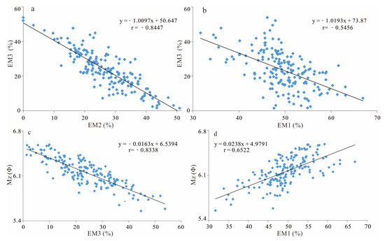 In order to clarify the relationships between EMs, we performed correlation analyses, which showed significant negative correlations between EM3 and EM2 (r = −0.8447) and between EM3 and EM1 (r = −0.5456); there was no correlation between EM2 and EM1. Simultaneously, we performed correlation analyses between Mz and EM1 as well as between Mz and EM3, which gave correlation coefficients of 0.6522 and −0.8338, respectively (Figure 6). Therefore, we infer that these EMs represent at least two different transport forces; EM1 represents a weak dynamic environment, and EM3 represents a strong dynamic environment.