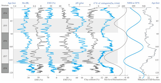 - Average Mz, clay content, EM1, and pH showed trough values in the ZF5 and ZF7 (loess) units that correspond to MIS 5b and 5d, while EM3 content showed peaks, indicating a relatively cold–dry environment, reflecting a weakening period of the EASM. The paleosol units (ZF4, ZF6, and ZF8) correspond to MIS 5a, 5c, and 5e. Mz, clay content, EM1 content, and pH showed high values, and EM3 content was relatively low, indicating a humid environment with more abundant precipitation, reflecting a period of EASM enhancement; MIS5e is the warmest and wettest.