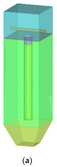 - Inlet and outlet boundary conditions: the speed of the gas was less than 68 m/s; the compressibility of the gas could be ignored []. Due to the pulse blowing cleaning, its blowing airflow was released from the nozzle within a very short time at a speed greater than 68 m/s, so the gas compressibility could not be ignored. The inlet boundary condition was, therefore, set as a pressure inlet. The outlet boundary conditions were set to pressure outlet boundary conditions.