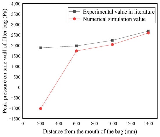 Under experimental conditions [] with a bag length of 1500 mm, an internal diameter of 127 mm, a blowing pressure of 294 kPa, a blowing distance of 150 mm, and a nozzle internal diameter of 13 mm, comparisons were made to verify the reliability of the numerical calculation model to simulate the dust cleaning system of the dust collector. The peak pressures at four points, 200 mm, 600 mm, 1000 mm, and 1400 mm from the top of the filter bag, were measured. A comparison of the numerical simulations with the pressure peaks obtained from the experimental measurements of Lu et al. [] can be seen in Figure 2.