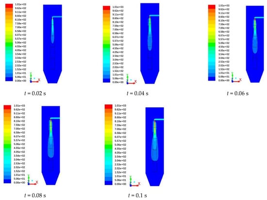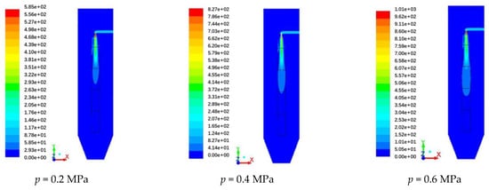 The pulsed air inlet was used to feed the air from the inlet of the blowpipe, and the pulse-blowing dust cleaning device was generally sprayed at a pressure between 0.2 and 0.7 MPa [,,]. Therefore, when the pulse width was 60 ms, the flow field of the soot cleaning with blowing pressures of 0.2 MPa, 0.4 MPa, and 0.6 MPa was simulated using the computational fluid dynamics software ANSYS-Fluent 19.2. It can be observed from Figure 3 that, when the blowing pressure increased from 0.2 MPa to 0.6 MPa, the flow rate of the blowing gas also increased. In the same blowing time, with the direction of spraying along the nozzle, the length of airflow diffusion is gradually increased, and the expansion area of the gas in the filter bag also increased. With the blowing pressure of 0.4 Pa and 0.6 Pa, the number of particles deposited in the second section of the filter bag is high, indicating that the airflow is fully expanded.