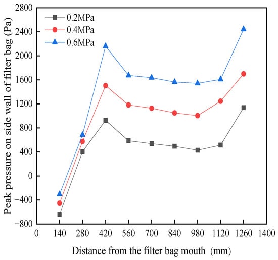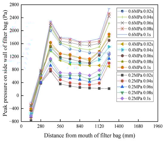 The peak pressure of the side wall of the filter bag under different blowing pressures is shown in Figure 4. To observe the force of the blowing airflow on the entire filter bag, measurements were taken along the height of the bag in the direction of nine evenly spaced points [,]: 140, 280, 420, 560, 700, 840, 980, 1120, and 1260 mm. It can be observed from Figure 4 that, as the blowing pressure increased from 0.2 MPa to 0.6 MPa, the pressure peak at the side wall of the filter bag increased.