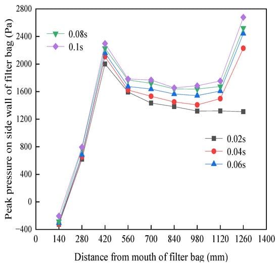 It can be observed from Figure 6 that, when the pulse width of 0.02 s extended to 0.1 s, the pressure peak of the side wall of the filter bag gradually increased. When the blowing time was 0.02 s, the pressure decay was more rapid compared to the other three blowing times, reaching a maximum at 420 mm and then decaying rapidly, while for pulse widths of 0.04 s, 0.06 s, 0.08 s, and 0.1 s, the maximum pressure at 560 mm was followed by a decline. When the pulse blowing was 0.02 s, the lower part of the side wall pressure of the filter bag did not rise; this was because the blowing time was too short, thus the airflow did not reach the bottom of the filter bag. There was a completely diffused expansion overflow, hence the lower end of the filter bag was not conducive to cleaning ash. When the pulse width was 0.04 s, 0.06 s, 0.08 s, and 0.1 s, with a small amount of blowing airflow to the bottom of the closed metal fiber filter bag, the speed dropped to 0, and there was airflow to the bottom of the filter bag wall near the diffusion, and the peak pressure at the side wall of the filter bag at 1260 mm went back up. With the increase in pulse width, the 0.08 s and 0.1 s points of the peak pressure curve of the side wall of the filter bag nearly coincided.