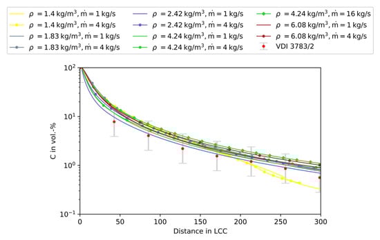 The parameter is dependent on the density at the source . It was fitted from simulations of heavy gas dispersion in flat, obstacle-free terrain compared to the wind tunnel experiments underlying VDI Guideline 3783/2 [3,4]. The mass flows investigated ranged from 1 kg/s to 16 kg/s and the gas densities from 1.4 kg/m3 (lower applicability limit of the VDI Guideline 3783/2) to 6.08 kg/m3, essentially covering the range of values relevant for hazard assessment. The source dimensions were set corresponding to the wind tunnel experiments so that a near momentum free release was ensured. Through the application of dimensional analysis relations, the results of the wind tunnel experiments can be converted to any source strength using the characteristic velocity scale and length scale , with the “effective” gravity and the volumetric source flow . Expressed as a function of Lcc, the concentrations are then independent of the mass flow and the gas density at the source.