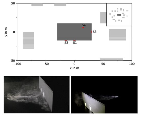 In these experiments, the source location was varied according to Figure 3. All sources are located at the storage building, which has three openings on the sides with a size of 4 m × 4 m (two on a long side: S1, S2 and one on a short side S3) and one opening with a size of 2 m × 2 m on the roof of the building (S4). During each experiment, only one source location was used, and the other three openings were closed, respectively.