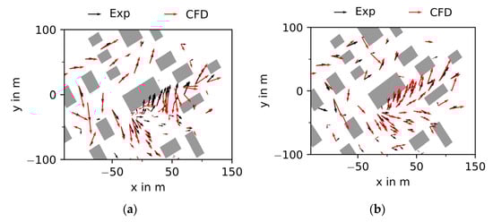 Comparison of the vectors of the horizontal wind components in a height of 2 m over the ground of the simulation (red arrows) with the experiments (black arrows); (a) incident flow at 30°; (b) incident flow at 35°.