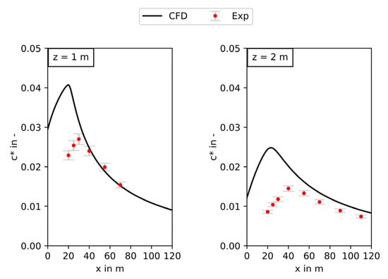 As for the validation of the turbulence of the wind field, which was carried out in a non-built-up environment in order to avoid obstacle-induced effects, the validation of the damping of the turbulent species transport due to heavy gas effects is also performed for a flat terrain. The concentration profile over the distance to the source is shown in Figure 9. The predicted concentrations of the heavy gas cloud are in good agreement with the measured values.
