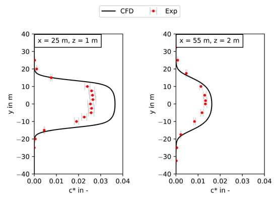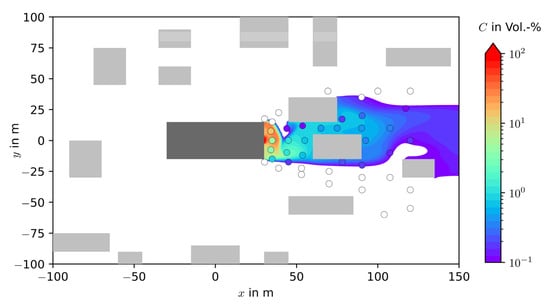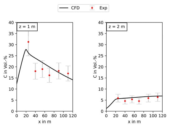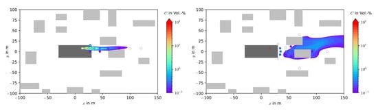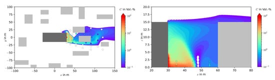 The vertical distribution of the concentration is shown in Figure 12 (right side) on a cut plane directly on the centerline of the source (y = 0 m in Figure 12, left side) in a range of the x-axis of 20 m–80 m. The “zigzag-behavior” at the top of the isocontour is not a physical effect but a rendering error of the visualization tool used. The white spots on Figure 12 (right side) between the two buildings are areas with concentrations below 0.1 Vol.%. The heavy gas behavior of the gas cloud is very well represented and in good agreement with the measurements.