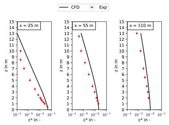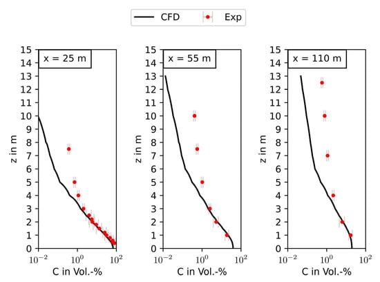 Vertical concentration profiles on the neutrally buoyant gas cloud centerline in 25 m (left), 55 m (middle) and 110 m (right) to the origin, and 5 m, 35 m and 90 m to the source, respectively.