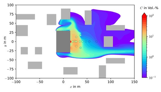 After the successful validation of the model, the calculation of hazardous areas for two specific cases is looked at more closely. Whilst simpler models (e.g., VDI Guideline 3783/2) only provide a radius of the hazardous area around the source, resulting in a circle, this model can predict irregular shapes and the hazardous area for sources that are not flush with the ground. As an example, Figure 13 shows the influence of the buildings on the shape and extent of the hazardous area for a vertical source (S1). The “canalization” effect downstream of the source leads to a clearly different estimate of the hazardous area compared to the circle around the source given by, e.g., the VDI Guideline 37837/2. Results such as the one shown in Figure 13 also lead to the question of whether simpler approaches are still to be considered as conservative, since it is not possible to take into account the canalization of the gas cloud in “channels”. As an example, the distance calculated by the VDI Guideline 3783/2 to reach 1 Vol.% is 126 m for the mean dispersion situation. This value is clearly lower than the distance reached by the isocontour of 1 vol.% in Figure 13; therefore, an underprediction of the maximum distance occurs here.