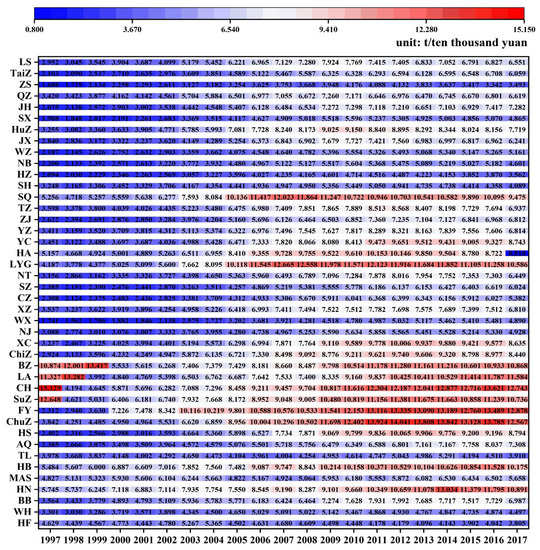 (1) From 1997 to 2017, the carbon emission intensity of the selected cities fluctuated but generally increased first and then decreased during the sample period. This demonstrates that the Yangtze River Delta region has carried out industrial optimization of industrial development. In recent years, the Yangtze River Delta region has implemented the economic strategy of “green development” to strengthen environmental management. In terms of the overall trend, the carbon emission intensity of Hefei decreased the most, and the absolute value of the decrease reached 0.82 tons/10,000 yuan, indicating that the relevant measures on the carbon emission of Hefei have achieved effective results. However, the carbon emission intensity of Suzhou increased rather than decreased, and the absolute value of the increase reached 3.64 tons/10,000 yuan. However, after reaching the peak, the carbon emission intensity gradually decreased, indicating that although the carbon emission intensity of Suzhou increased significantly during the sample period, it was also effectively controlled. Before 2002, only Hefei’s carbon emission intensity was greater than the average of the entire Yangtze River Delta region, but after 2002, all provincial capitals were smaller than the average of the Yangtze River Delta region. This indicates that cities with higher GDP have lower carbon emission intensity and higher levels of low-carbon economic development. Among the 42 cities in the Yangtze River Delta, Huai’an City showed the greatest decrease from 5.17 tons per 10,000 yuan to 0.81 tons per 10,000 yuan, while Fuyang City showed the greatest increase in the absolute value of 10.57 tons per 10,000 yuan.