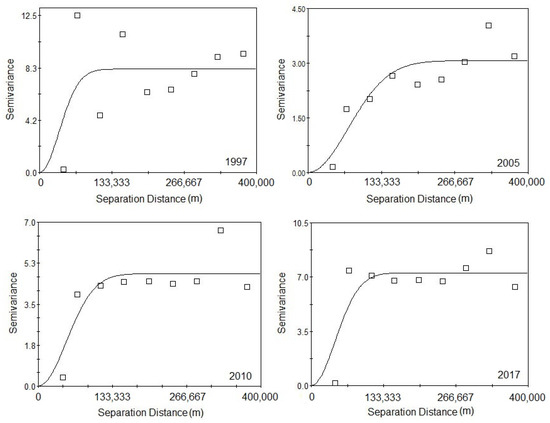GS + 9.0 software was utilized to construct the semi-variogram of carbon emission intensity in different years and conduct correlation analysis (Figure 5 and Table 1). According to the variogram graph of 1997, 2005, 2010, and 2017 constructed using a Gaussian model, it can be seen from the graph that the sample points are gradually close to the curve, indicating that the correlation between cities in the Yangtze River Delta is becoming more and more obvious. Cities are also more closely connected and interact with each other. The nugget effect [C0/C0 + C] reflects spatial dependence of carbon emission intensity, and the size of the nugget effect reflects the strength of the spatial correlation of carbon emission intensity. The larger the C0/C0 + C is, the more dispersed the spatial distribution of carbon emission is, and the weaker the correlation is. As can show in Table 1, R2 shows an overall increasing trend, and C0/C0 + C is 1.22%, 0.07%, 0.21%, and 0.14%, respectively, indicating a strong spatial correlation of carbon emission intensity. Gold block values C0 are 0.1, 0.002, 0.01, and 0.01, respectively, indicating small errors. Abstention values C0 + C were 8.23, 3.07, 4.08, and 7.28, respectively, indicating that the sum of random variation and structural variation in carbon emission intensity was small. Although the ratio of the nugget value to the abstention value showed a trend of first decreasing, then increasing and then decreasing, the ratio of nugget value to abstention value was much less than 25%, indicating that the spatial difference of carbon emission intensity in the region was small, and there was a strong spatial correlation. The integration level grew higher and higher, and the improvement of the integration level could significantly reduce the carbon emission intensity of the city [28].