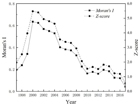 Variation of Moran’s index of carbon emission intensity in the Yangtze River Delta from 1997 to 2017.
