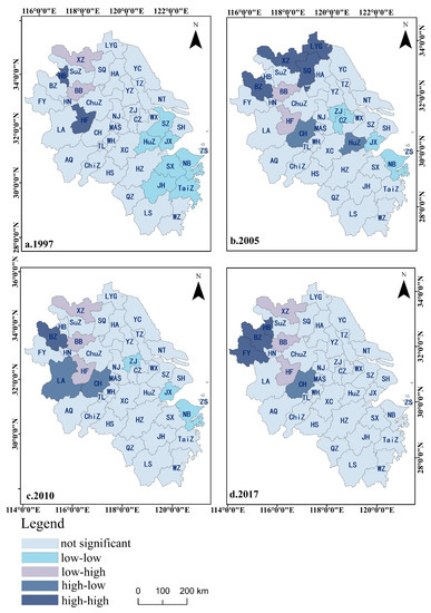 GeoDA software was utilized to calculate the global and local Moran’s index of carbon emission intensity in the Yangtze River Delta from 1997 to 2017. It can be seen from Figure 6 that the global Moran index of all years is conclusive, and almost all pass the 90% significance test. This indicates that the carbon emissions in the Yangtze River Delta region have an obvious spatial positive correlation, showing a tendency toward a centralized distribution.
