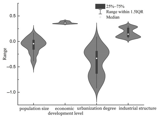 It can be seen from Figure 8 that, on various indicators, the regression coefficient of population size ranges from −0.462 to 0.171. Population size has a bidirectional effect on carbon emission intensity, but its effect on carbon emission intensity is more inhibitory than promoting. The economic development level has a complete promoting effect on carbon emission intensity, and its average regression coefficient on carbon emission intensity is 0.3674, which shows that the promoting effect is not obvious. The increase in urbanization degree has a two-way effect on carbon emission intensity. The regression coefficient of the urbanization degree ranges from −0.920 to 0.091, and the negative effect is quite strong. The increase in the proportion of the secondary industry in the industrial structure will lead to an increase in carbon emission intensity in general. Its average regression coefficient for carbon emission intensity is 0.1702, so the effect is limited.