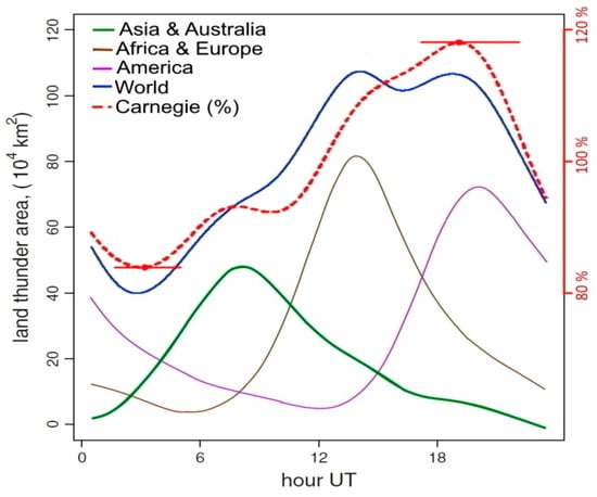 Variations in the atmospheric electric field due to regular, periodic sources of disturbances reflect its dynamics under “fair weather” conditions. The classic example of the global variation of the electric field is the unitary variation, which is characterized by the diurnal change in the magnitude of the electric field with a maximum of around 19:00 UT, which is known as the Carnegie curve [13]. The generally accepted explanation for this phenomenon is that both the number of thunderstorms and the magnitude of the atmospheric electric field E across the Earth reach a maximum at 19:00. The maximum thunderstorms at middle latitudes are observed in the summer afternoon hours, which is due to the creation of favorable conditions for their development at this time, and the minimum is observed for the time before sunrise. Figure 1 represents a comparison between total land thunderstorm area (thick solid line, left-hand axis) with its regional contributions [14], and the Carnegie curve (red dashed line, right-hand axis) calculated in percentage of mean. The seasonal range in timing of the Carnegie curve’s maximum and minimum is shown by horizontal bars at their annual mean values. The land thunder area is the land area over which storms occur and is accepted as a rough measure of the activity of thunderstorms in all parts of the world.