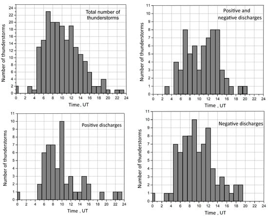 It is also obvious that there are much fewer thunderstorms with positive discharges than with negative discharges. Their number does not exceed 24%. However, this value is twice the generally accepted ideas about this value in the scientific literature [19,20].