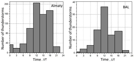 Diagrams of the daily distribution of thunderstorm events based on 3-h data from Almaty meteorological station for the period 2005–2019 (archive weather from Almaty) and from Big Almaty Lake (BAL) meteorological station for the period 2011–2014 and 2017–2020 (archive weather from Big Almaty Lake (BAL)) are presented in Figure 4. The geographical coordinates of these stations differ slightly, but they are located below the high-mountain Tien-Shan station (BAL—43°07′ N, 76°54′ E, 2506 m above sea level; Almaty—43°15′ N, 76°55′ E, 787 ÷ 851 m above sea level).