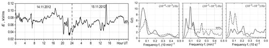 For the third case, the values of the atmospheric electric field at the high-mountain station under the influence of the large geomagnetic storm, Dst = −103, and under “fair weather” conditions for the 14 November 2012 event are shown in Figure 7 (left panel). The values of the electric field characteristic of “fair weather” conditions were not observed in this event, but significant field fluctuations were observed from 40 to 120 V/m. The results of calculations of the normalized power spectra of variations in the atmospheric electric field during magnetic storms (dashed line curve) against the background of spectral estimates of the undisturbed atmosphere (solid line) are presented in the right panel of Figure 7. Spectral peaks exceeding the 95% confidence interval were observed in the minute ranges 10−3 ÷ 10−2 Hz and 10−2 ÷ 10−1 Hz.