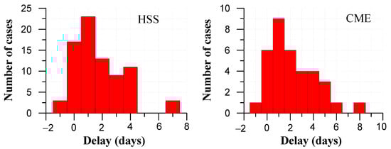 Figure 9 shows the frequency of occurrence of the thunderstorm events as a function of time delay between an observed thunderstorm and the arrival of geoeffective CMEs and HSSs to the Earth. One can see that thunderstorm activity was most likely to increase during or 1–2 days after the arrival of geoeffective CMEs and HSSs to the Earth.
