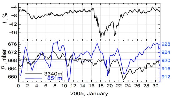 Figure 10. Variations in the intensity of the neutron component of cosmic rays and atmospheric pressure at different heights.
