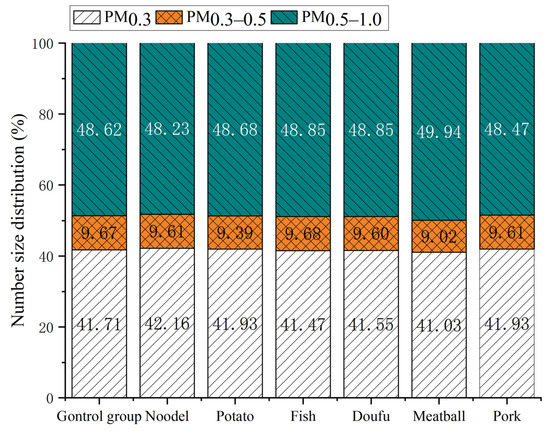 The boiling process of water is different from that of edible oil. As can be seen from the figure, the percentage of PM0.3 decreased significantly (from 90% to about 10%) within 60 s of it entering the boil. At the same time, the proportion of PM0.3–0.5 and PM0.5–1.0 increased dramatically (from 9% to 15% and 3% to 80%, respectively). In addition, with the continuous boiling of water, the particle size distributions of PM0.3, PM0.3–0.5, and PM0.5–1.0 all fluctuated, and the fluctuation period was 60 s. Similar to the number concentration, the fluctuations of PM0.3, PM0.3–0.5, and PM0.5–1.0 were the opposite so when the proportion of PM0.3 decreased, the proportions of PM0.3–0.5 and PM0.5–1.0 increased. In conclusion, in the process of water heating, the proportion of small particles was high. When the water reached boiling, the small particles rapidly decreased, and the larger particles of 0.3–0.5 µm occupied higher proportions.