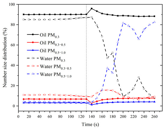 Figure 5 compares particle size distributions with time when heated water and corn oil are added. We unified the timelines of oil heating to the smoke point and water heating to boiling. It was found that the particle size distribution was significantly different between corn oil and water heating. When the corn oil was heated to the smoke point, the proportion of PM0.3 increased, while the proportions of PM0.3–0.5 and PM0.5–1.0 decreased correspondingly. The extreme value appeared approximately 10 s after the smoke point. The ratio of PM0.3 in corn oil increased from 90.16% to 95.88%, while the proportions of PM0.3–0.5 and PM0.5–1.0 decreased from 6.78% and 3.06% to 2.91% and 1.21%, respectively. During the initial heating of cooking oil, more smaller diameter particles were produced. With continuous heating, the proportion of PM0.3 gradually decreased, while PM0.3–0.5 and PM0.5–1.0 gradually increased. At the end of the heating process, the lowest PM0.3 proportion was 88.26% at 260 s. The proportions of PM0.3–0.5 and PM0.5–1.0 reached the maximum values in the whole process, which were 7.67% and 4.06%, respectively. This indicates that the proportion of large-diameter particles increased with the heating process, but the ratio of small particles less than 0.3 μm was still high.